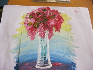 Подождем минутку, когда контуры вазы просохнут и нарисуем стебли наших цветов (рис. 3). Теперь можно рисовать цветы, например, сирень. Для этого «распушим» нашу среднюю кисточку (просто покрутив её по палитре-тарелке), наберём немного белой и малиновой краски, и легко постукивая по «холсту», изобразим гроздья сирени. Важно помнить, что источник света у нас – слева и сверху. Поэтому добавляем лёгкие мазки кистью с белой краской на наши гроздья сирени слева и сверху. Если добавить немного тёмной малиновой краски, то сирень станет объёмной (рис. 4). Маленькой кисточкой проводим 2–3 белых вертикальных штриха в вазе и 3–4 горизонтальных плавных штриха — покажем фактуру стекла и объём вазы (рис. 5). Нарисуем зелёные листочки сирени маленькой кисточкой, просто касаясь «холста», и наш подарок готов (рис. 6)!