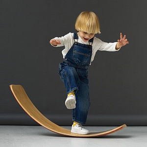 Теперь предложите ребёнку рассмотреть покупку, попробовать постоять на доске. Будьте рядом, чтобы подстраховать малыша в случае угрозы падения. Как правило, дети быстро усваивают принцип удержания равновесия, к этому подталкивает природный инстинкт самосохранения. К тому же, высота валика, на котором расположена доска, небольшая, и ребёнок может легко соскочить с доски на пол.