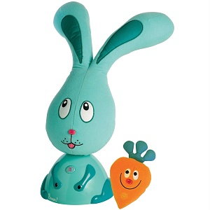 Банни – милый кролик голубого цвета на маленьких колёсиках, который играет с ребёнком в догонялки и прятки. Сам Банни сделан из пластмассы, а голова у него – тканевая. К игрушке прилагается небольшая мягкая морковка с инфракрасным датчиком. Эта морковка крепится на руку ребёнка как браслет с помощью липучки. По сути, кролик следует за морковкой или от неё. Чувствительность датчика составляет 3,5 метра.