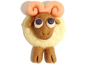 Кончиком стеки продавим ноздри. В верхней половине мордочки продавим двумя пальцами лёгкие углубления для глаз барашка. Теперь самое время приложить голову к тельцу.