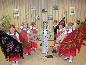 Педагог: А знаете, ребята, испокон веков на Руси на праздник Троицы девушки и юноши завивали на берёзе ленточки. Давайте и мы с вами завяжем на берёзке свои ленточки по старому обычаю. (Дети присаживаются на стульчики, берёзку тоже приглашают погостить.)