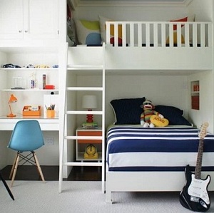 Любой ребёнок нуждается в зоне отдыха. Но если поставить детскую кровать, то она займёт почти всё пространство. А если ограничиться диваном, то все хлопоты по сборке-разборке снова лягут на плечи родителей. Вознесёмся над суетой – поставим кровать-второй этаж. Посудите сами: все пространство внизу будет свободно для игр или для хранения вещей и игрушек. Сам факт того, что у него есть лесенка на кровать, приведёт ребёнка в неописуемый восторг. Сколько игр придумает малыш! Кроме того лестница – замечательный спортивный тренажёр. Для оформления комнат подростков отлично подойдёт кровать-убирающаяся в шкаф.