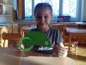 Молодцы! (Дети садятся на места.) Ребята, посмотрите какого хамелеона, мы с вами сегодня сделаем, забавный? Посмотрите какой у него длинный язык. Зачем ему такой язык знаете? (Показ образца поделки.) Правильно, он ловит этим языком насекомых и кушает их.