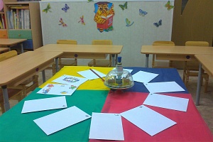 Викторина проводится в группе, оформленной соответствующим образом. В центре группы два стола. Один разделён на 4 сектора, каждому сектору соответствует свой цвет, и конверты с заданиями.Секторы: 1. Рассуждай-ка. 2. Умей-ка. 3. Расставляй-ка. 4. Отвечай-ка.