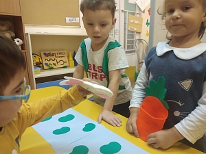 Педагог: Сядьте на стульчики. У нас осталась последняя покупка. Кто там? (Педагог достаёт морковку, в которой сидит зайка.)