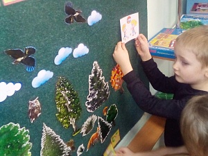 Воспитатель: Чтобы вернуться, расскажем правила поведения в природе: не собирать незнакомые грибы, ягоды, растения. (Дети возвращаются к юле.) Чем же ещё может являться лес? (Выпадает изображение «Дети играют».) Как вы думаете, что же означает это изображение? Идёмте скорее проверять! (Дети подходят к изображению.) Смотрите, ребята, тут картинка какая-то! Что бы это значило?