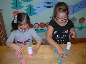 Состав пособия: пособие состоит из цветных колечек, сделанных из пористой резины и картонных трубочек-втулок.