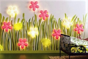 Фигурными бра на стене никого не удивишь – решение, прямо скажем, не оригинальное. Если только это не дизайнерские настенные светильники! Фигурные бра могут дополнять сюжетный рисунок на стене. Вот зелёный лужок, а на нём совсем непростые цветочек и букашка. Дёрни за верёвочку – весь луг озарится светом.