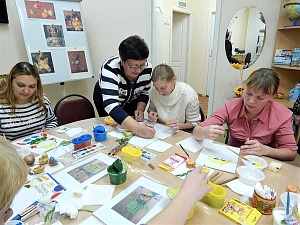 Самостоятельная творческая работа. Во время самостоятельной деятельности родителей педагог оказывает им необходимую помощь в виде подсказки, демонстрации приёмов изображения на своём листе, привлечения внимания к деталям рисунка, обращения к репродукциям и изделиям декоративно-прикладного искусства. Подсказывает, как сочетаются между собой разные цвета и оттенки, и что предпринять, чтобы отпечатки разных штампов не накладывались друг на друга и не вносили неразбериху в изображение. Знакомство с особенностями штамповочных материалов и их влиянием на создание образа способствует формированию у родителей осознанного отношения к творческому процессу.