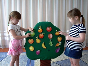 На столе перед деревом расположены карточки с изображением фруктов и овощей. Педагог просит прикрепить к дереву только то, что растёт на дереве.