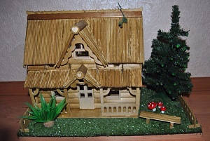После того, как все элементы были собраны в замечательный домик с верандой, мы приступили к его декорированию. Для декора своей постройки мы использовали дополнительные деревянные палочки – шпажки и рейку с полукруглой стороной, имитирующая половинчатую часть бревна. Мы решили, что такой чудесный домик обязательно должен где-то стоять, поэтому на лист ДСП приклеили небольшой кусочек искусственного газона и на него установили свою постройку. Конёк дома, который входил в набор, мы использовали в качестве резного декоративного забора. На участке была «посажена» ёлка и грибы, а также установлена скамеечка, сделанная из палочек от мороженого. Задней части у домика не предусмотрено, поэтому внутрь можно повесить светодиодную лампочку, чтобы в тёмное время суток в домике было уютно.