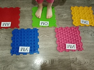 На полу в два ряда разложены массажные пазлы. Перед ними слоги. У ребёнка в руках малый мяч, в другой – мешочек с песком. Ребёнок по указаниям воспитателя сначала проходит по пазлам определённого цвета, на которых «написаны» буквы, слоги или слова. По команде воспитателя (назвать мягкий или твёрдый слог) на каждый шаг ребёнок называет слог и в зависимости от слога подбрасывает либо мяч, либо мешочек.