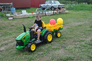 Модель поразила нас своей универсальностью, стала отличным подарком для нашего юного фермера. Сын испытал такие позитивные эмоции, которые не вызывала ни одна подаренная ранее игрушка, радость не сходила с его лица. Вначале он долгое время изучал устройство, рассматривал его составные части и только потом с опаской уселся за руль. Освоил управление он тоже не сразу, прошло несколько дней, прежде чем смог уверенно двигаться вперёд, поворачивать влево и вправо, давать задний ход и преодолевать препятствия.