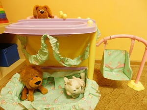 Модель пеленального столика также даёт возможность воспроизвести различные игровые ситуации: переодеть малыша, помыть, покачать, сложить его вещи в гардероб. Так, простые игровые действия готовят детей к социально-значимым ролям, приучают к порядку и ответственности.