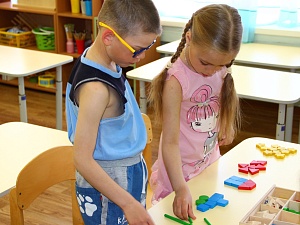 - построение из геометрических фигур изображений, а затем объёмных предметов по образцу, путём наложения фигур на схему, после при зрительном соотнесении с ней и в дальнейшем по памяти или замыслу;