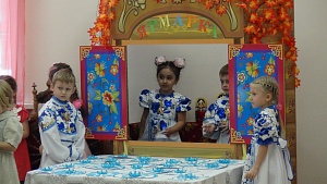 Материалы и оборудование: презентация «Сказочная гжель», мини-музей «Синеокая гжель», ярмарочный уголок, музыкальный центр, диск с записью песен: вальс из кинофильма «Три орешка для Золушки», «Дорога добра» (из кинофильма "Маленький Мук"), подборка русских народных мелодий.