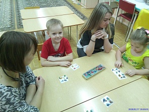 Логопед: А теперь игра «Закрой картинку». У каждого участника игры карточка с 4-я картинками. Например: пила, посуда, попугай, подушка. В названии каждой картинки есть звук [п] или [пь]. Надо закрыть каждую картинку фишкой синего или зелёного цвета, в зависимости от того, мягкий [пь] или твёрдый [п] согласный звук в слове. (Дети выполняют задание вместе с родителями.)