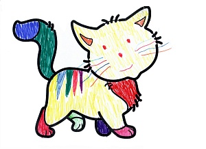 Примеры работ: на рисунке 2 изображён разноцветный котёнок: «Этот котёнок искупался в радуге и стал разноцветным, у него весёлое настроение, потому что радуга яркая и мягкая, как облачко, ему было весело в ней купаться». В данном описании и рисунке у ребёнка явно преобладает хорошее настроение, готовность к играм, оживлённое поведение, у малыша развита фантазия. На рисунке 3 серый плачущий котёнок – «Котёнок грустный, он идёт и плачет, потому что он потерял свою любимую игрушку и ему не с чем больше играть». В процессе беседы над данным рисунком, явно выражающим грусть и подавленное состояние, следует аккуратно расспросить ребёнка о том, где котёнок мог потерять игрушку, почему это случилось, что же можно сделать, чтобы котёнок перестал плакать. (В нашем случае ребёнок забыл любимую игрушку в детском саду, поэтому переживал. Чтобы котёнок перестал плакать, мы решили дать ему молочка и новую игрушку, а завтра забытого в саду слоника малыш обнимет и накормит любимым лакомством, чтобы слоник не обижался.)