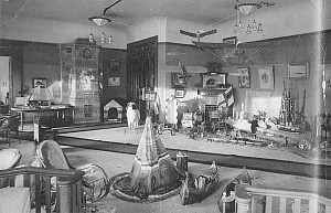 Любой мальчишка с раннего детства мечтал о военных подвигах. В игральной находились доспехи средневекового рыцаря, военное индейское снаряжение: уменьшенные в размере две пироги, луки, головной убор и вигвам.