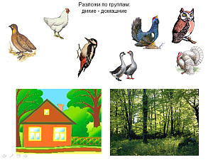 2-й вариант: разложить птиц по группам по признаку: дикие — домашние.