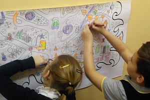 Когда все картинки на листах раскрашены, мы с детьми склеиваем эти листы бумаги и размещаем получившееся цельное изображение на стене. Можно сначала склеить, а потом раскрашивать картинки в вертикальной плоскости, последовательность действий здесь не имеет значения.