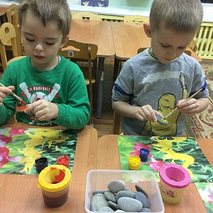 Этот нетрадиционный материал для рисования повышает интерес детей к изобразительной деятельности, дополняет представления о возможности использования камней, развивает тактильные ощущения ребенка, воображение и фантазию, технику рисования кистью. Можно рисовать на тёмных камнях чистой водой и наблюдать, как рисунок исчезает при её испарении. Можно предложить детям выбрать камешки любой формы и пофантазировать, рассказать, на что или на кого они похожи. С помощью красок и кисти дошкольники «оживляют» божью коровку или забавную мышку. Это может быть домик или машинка, весёлая мордочка котёнка, рыбка, птица. Детям очень нравится рисовать на камнях, их это просто завораживает, а рисунки получаются удивительными и очень красивыми.
