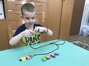 Материал: шнурок; деревянные плоские бусины с изображением коровы, кошки, собаки, кролика и корма для них - травы, моркови, молока в пакете, косточки.Предлагаю ребёнку собрать бусы в следующем порядке: после каждой бусины с изображением животного нанизать бусину с изображением его пищи, например: корова - трава; собака – косточка.