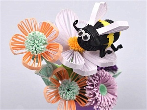 Железный цветок нужно обклеить блестящей липкой бумагой, а на картинки пчёлок приклеить с обратной стороны магнит. Пчёлки будут магнититься к цветку.