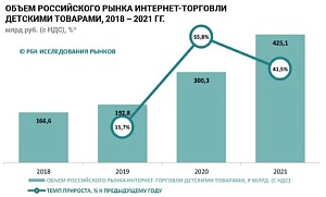 В стороне от столь масштабных рыночных процессов не остались и операторы рынка детских товаров. По оценкам «РБК Исследований рынков», онлайн-продажи товаров детского ассортимента в 2020 году выросли на 55,8% и достигли показателя в ₽300,3 млрд. Динамичный рост продолжился и в 2021 году: суммарные продажи категории через интернет увеличились еще на 41,5% до ₽425,1 млрд. Впрочем, стоит отметить, что в 2021 году весомый вклад в рост онлайн-продаж внесла инфляция: средний заказ стал обходиться онлайн-покупателям на 12,3% дороже. Если оценивать рост объема российского рынка в сопоставимых ценах, то он составил более скромные 26%.