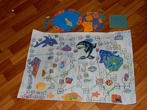 Я мама двух замечательных деток Дима 7 лет и Даша 4 года. Все вместе мы сделали игру-бродилку «Подводная рыбалка». У нас было разделение обязанностей: кто-то клеил, кто-то вырезал, кто-то рисовал – всем работы хватило.Сначала мы взяли ватмат формата А3, раскрасили его светло-голубым цветом, дождались пока всё высохнет. Из книжек и журналов вырезали морских обитателей, приклеили их к раскрашенному ватману. Потом восковым карандашом сделали нумерацию, нарисовали стрелки, написали, где «Финиш» и «Старт». Основное поле готово.