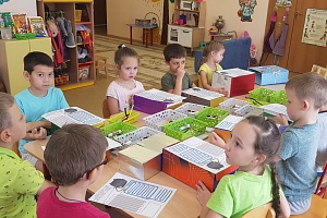 Воспитатель: Ребята, обратите внимание, чтобы постройка получилась прочная, необходимо следовать схеме. Проходите к своим местам за столом и приступайте к работе. (Дети находят на столе свои инженерные книги и присаживаются за столы. Называют части холодильника, которые нужно доделать, и затем конструируют.)