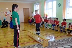 Космические перегрузки. Дошкольникам предлагается по очереди «выйти через люк в открытый космос» - пролезть в игровой туннель из ткани, перепрыгнуть через натянутую веревку и «в условиях невесомости» пройти по скамейке, удерживая равновесие. (Дети успешно выполняют все задания, и им вручают вторую букву.)
