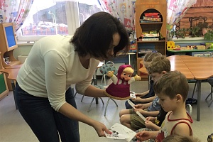 Материалы и оборудование: фонограмма «Песенка про следы», кукла би-ба-бо Маша, карточки с изображением следов животных, фотографии с дикими животными, дидактическая игра «Накорми животное», медали «Следопыт» по количеству детей.