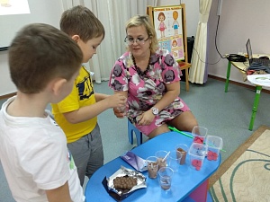 Воспитатель: Как вы думаете, что произойдёт с молоком, если в него добавить одну порцию какао? И что произойдёт с какао? (Молоко станет коричневым, какао растворится. Дети делают вывод. Какао порошок горький на вкус и может легко растворяться в жидкости, в молоке. Фишки правильно отвечающим детям.)