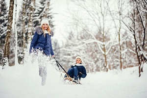 На горке ветер больно бьёт в лицо, и нежная кожа ребёнка моментально краснеет. Что иметь с собой: защитный зимний крем (не увлажняющий!), гигиеническую помаду, балаклаву или тонкий флисовый подшлемник. За 15-20 минут до выхода густо нанесите на лицо ребёнка специальный жирный крем «от непогоды». Смажьте губы гигиенической помадой. Если очень холодно и ветрено, под капюшон наденьте тонкий подшлемник — он защитит щеки и подбородок лучше, чем шарф.