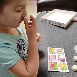 Мы немного упрощаем правила, так как если сразу брать все баночки, довольно быстро запутаешься и притупится обоняние, особенно у ребёнка. Играем мы следующим образом: дочка выбирает понравившуюся карточку, а я подбираю по номерам на ней баночки, они тоже пронумерованы.