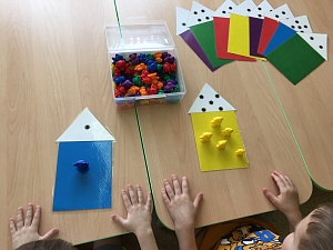 Воспитатель: Ребята, поочередно и как можно быстрее перебирайте пальцы рук, соединяя их в кольцо с большим пальцем последовательно. Выполняем в прямом и в обратном (от мизинца к указательному пальцу) порядке. Сначала упражнение выполняется каждой рукой отдельно, затем двумя руками одновременно. (На столе лежат 10 домиков. Домики разные по цвету и точками указано число. Проводится игра «Домики для медведей».)