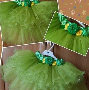 Если нужно чтобы край слоя был воланами, то обрабатываем его зигзагом, втачивая туда леску. При этом леску придётся немного натянуть. Если край воланами не нужно делать, то оставляем его не обработанным. Затем из широкой атласной ленты делаем пояс и притачиваем к нашей юбке. Соединяем края юбки машинной строчкой, вставляем резинку в пояс и наша юбочка готова. Осталось только сделать декор – бусины, стразы, цветы из лент и прочее.