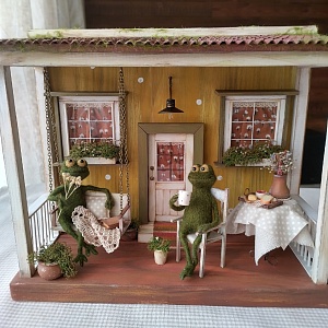 Ну а дальше начинается создание уюта в домиках. В украшении интерьера использую ткани, вязанные элементы, сухоцвет, который заготавливаю сама. Как полноправная хозяйка жилища, я очень люблю развешивать или раскладывать в своих домиках букетики сухих полевых цветочков. Раньше я лепила персонажей из полимерной глины, а совсем недавно освоила технику сухого валяния и теперь все мои зверюшки – шерстяные, тёплые, мягкие, милые! Так, мне кажется, они выглядят более реалистично. В каждом домике есть своя уникальная история, персонаж с личным характером, привычками и увлечениями. Оттого каждое изделие носит свой оттенок неповторимости и уникальности.