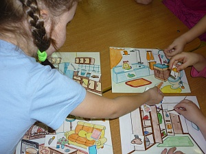 Вариант 2. Дети наводят порядок в комнатах, как в варианте 1 игры. Затем каждый ребёнок выбирает из всех убранных из комнат и расположенных в центре стола предметов только те, которые подходят для его комнаты.
