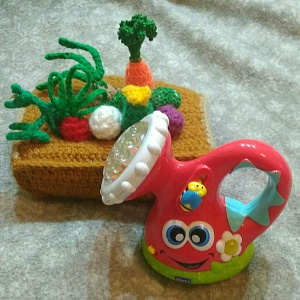 С этой игрушкой можно придумать несколько развивающих игр для деток, расскажу немного о нашей игре в огород с сыном. Для забавы понадобятся овощи и фрукты, можно сшить, например, из фетра, сделать из бумаги или купить готовые наборы в магазине. Я обожаю вязать – поэтому у сыночка появились вязаные овощи и соответствующая им грядка. Сын берёт сначала все овощи, сажает их на грядку, потом поливает лейкой. Затем снимает урожай и готовит из него суп, которым угощает все свои игрушки. Очень забавно за этим процессом наблюдать - делает всё, как взрослый.