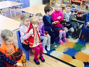 Кукла: И не только ели! Расписные деревянные ложки были музыкальными инструментами. Давайте попробуем поиграть на русских народных инструментах. (Дети берут деревянные ложки, балалайки, гармонь, трещотки. В их сопровождении звучит мелодия «Ах, вы сени, мои сени».)