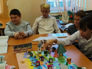 Дети, каждый со своей игровой фишкой, отправились на поиски котёнка на игровом поле, встречаясь с бабушкой, дедушкой, папой, мамой, братьями, сёстрами, друзьями. Здесь мы добавили в игру эффект неизвестности: каждый ученик не глядя вытаскивал из мешочка кубик с фрагментами городских объектов на гранях, самостоятельно устанавливал его на игровом поле и рассказывал о нём. Искали в магазине, в кафе, в аптеке, на почте, на катке, параллельно изучая новую лексику и повторяя старую. Котёнка не могли найти, пока каждый из учеников не попытал счастья. А потом они все вместе случайно нашли варежку, в которой и спрятался котёнок!