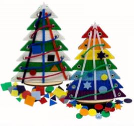Игры «Ёлочка двухцветная» или «Ёлочка радужная» во многом похожи по своему составу: ёлочка, состоящая из 7 веточек разной ширины (в одной игре используются радужные цвета, а в другой только белые и зелёные веточки-ярусы), фанерная основа из двух частей (ось и подставка), украшения (геометрические формы, звёздочки, шнурки, верёвочки).
