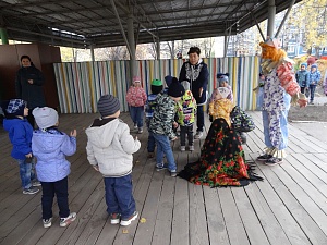 (Дети располагаются на площадке.)Ведущий: Здравствуйте, дорогие ребята. Подскажите, пожалуйста, какое сейчас время года? (Ответы детей.) Как вы смогли это определить? (Ответы детей. В случае затруднения ведущий может задать наводящие вопросы: «Какая погода бывает осенью?», «Как одеваются люди?», «Что происходит с деревьями?». После вступительной беседы звучит музыка, под которую появляется Баба-Яга.)