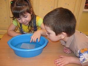 Воспитатель. Ребята, а вам известно, что в Бумажной стране есть озеро? Пойдёмте, посмотрим, что в нём плавает? (Подводит детей к столу, на котором стоит миска с водой.) Кто догадался, что это?