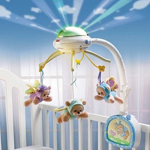 Проектор-мобиль 2-в-1 от FisherPrice обладает навесом, который располагается над головой малыша с четырьмя плюшевыми игрушками (сине-зеленый кит, белый полярный медведь, зелёный крокодил и жёлтый лев). Мягкий свет проецируется от основания мобиля на внутреннюю поверхность навеса купола. Когда ребёнок подрастёт, планка с навесом убирается, и световой рисунок можно проектировать прямо на потолок. Игрушка в течение 20 минут проигрывает музыку, такую как классические колыбельные (Бах, Бетховен и Моцарт), звуки природы, океанов, звук биения сердца, как в утробе матери. Мобиль надёжно устанавливается: инновационный метод крепления позволяет размещать его на большинстве детских кроваток. Пусть ваш малыш растёт счастливым и здоровым!