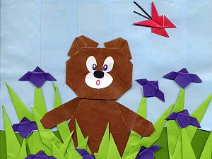 2. Медведи-оригами. Детей знакомят со стихотворениями, которые вошли в сборник стихов Е.А. Гайдаенко «Из жизни медведей», затем предлагают дома совместно с родителями разучить одно из них и выполнить соответствующую его содержанию фигурку медведя в технике оригами. Педагог заранее готовит игровое поле «Лес» с полосками двустороннего скотча, на котором каждый ребёнок размещает свою поделку и рассказывает стих про медведя в малиннике, залезающего на сосну, или играющего в прятки.