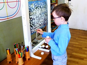 Как известно, рисовать можно не только карандашами или кисточками, но и пальцами. И не только по бумаге, но и по стеклу. Стекло дарит новые визуальные впечатления и тактильные ощущения, раскрепощает, вселяет уверенность в себе. Пособие «Прозрачный мольберт» эффективно используется в работе с детьми со сходящимся и расходящимся косоглазием, миопией, астигматизмом, гиперметропией