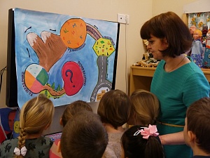 Материалы и оборудование: карта мира, карта страны «Заниматика», планшеты и фломастеры, карточки с математическими задачами, геометрические тела, слоги для составления слов, календарь природы, прозрачная ёмкость для воды, аквариумный сачок, камни, песок, бумага разной плотности, пенопласт, предметы из различных материалов, карточки наблюдения, листы для оригами.